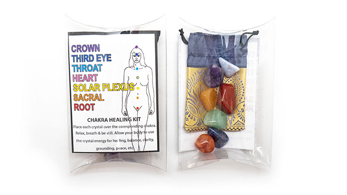 Basic Chakra Kit with a random assortment of 7 small stones, 1 to be placed on or used for each corresponding chakra. Drawstring pouch included to store the stones when not in use.