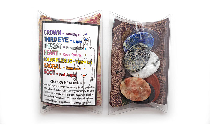 Basic Chakra Kit with 7 worry stones, 1 to be place on or used for each corresponding chakra. Drawstring pouch included to store the stones when not in use. Worry Stone Kit has an option for either a Rose Quartz or a Kababa Jasper for the heart chakra stone.